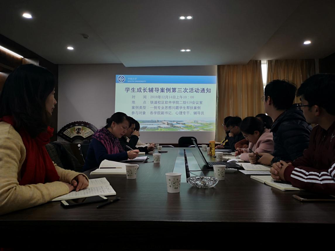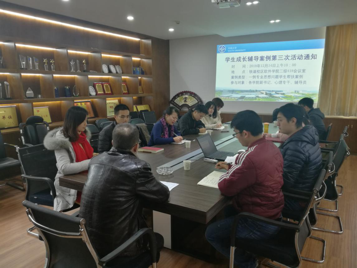 2018年12月14日上午10:00,铁道校区第三次成长辅导案例督导会在软件学院举行,本次会议由铁道校区心理健康教育中心主任姜美霞老师组织召开,来自软件院、信息院、土木院、交通院和建艺院的心理专干和辅导员共计13名老师参加了此次案例督导会。