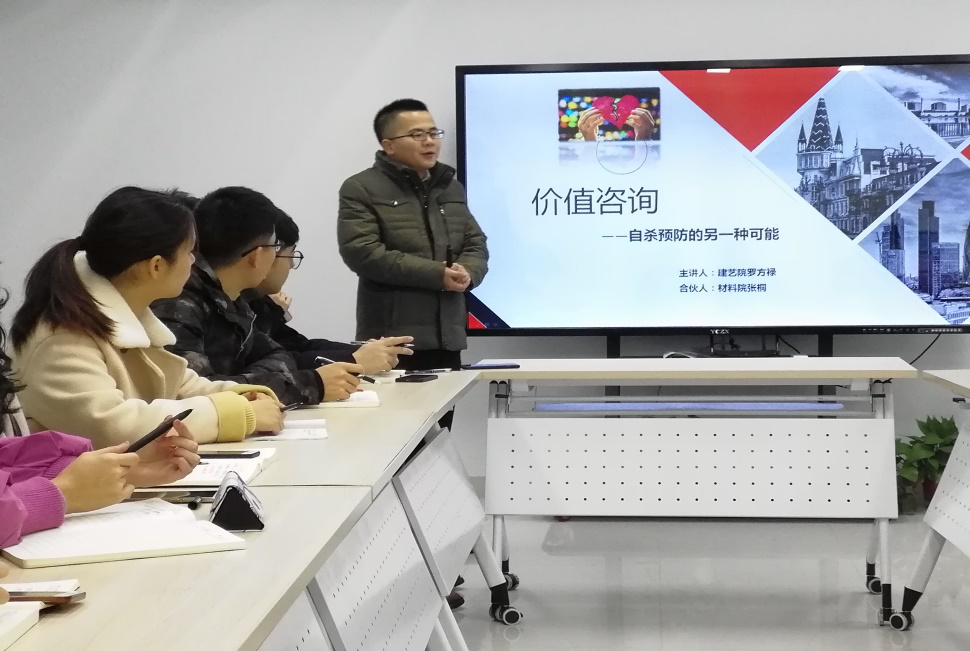 第一个环节由建艺院罗方禄老师分享了他近几年来对学生思政工作的思考与探讨,做了一个题为《价值咨询——自杀预防的另一种可能》的主题报告,从“价值咨询的意义”、“何为价值咨询”、“如何开展价值咨询”三个方面进行了阐述。他认为,“在信息、知识、娱乐文化共同缔结的资本联合体中,知识资本化、负面价值商品化,高校辅导员迎来的是一场价值争夺战。” 在此时代背景下,辅导员除了帮助学生解决具体问题之外,更应通过各种有效的对话方式对来访者进行价值观念方面的思想引导与疏通,帮助其解决思想价值观念方面的困惑及问题,才可能更好的预防学生各种危机问题的产生,因此,他提出了“思政诊所式”思想政治教育方法——价值咨询。进而,罗老师又从辅导员如何政治站位,培养价值思维、提升自我解惑能力,适度把握时空、增强解惑效果,审视现实困惑、树立问题意识等方面深入介绍了如何开展价值咨询工作。接着,与会老师就罗老师的报告也纷纷发表了自己的一些想法和看法。