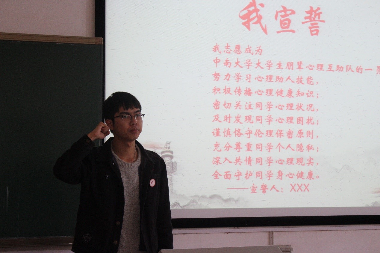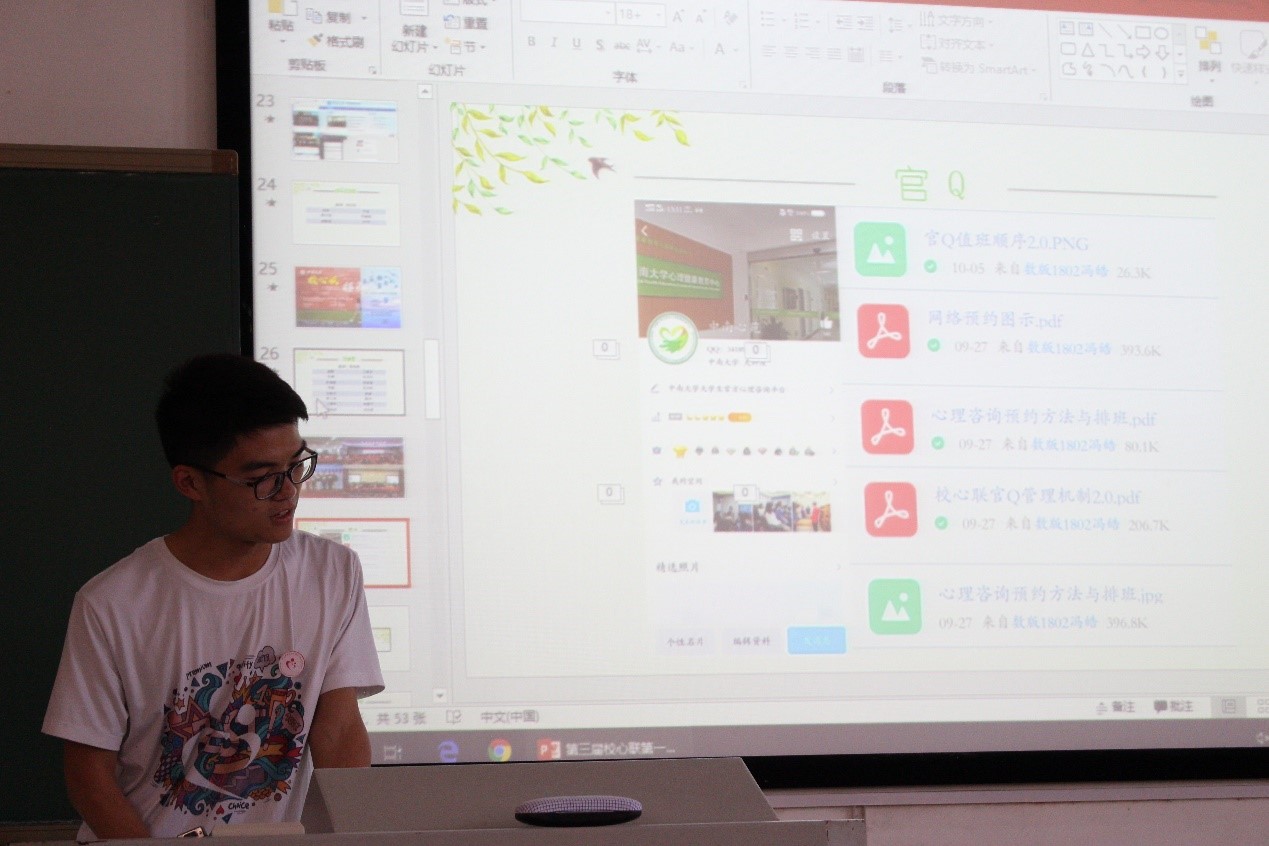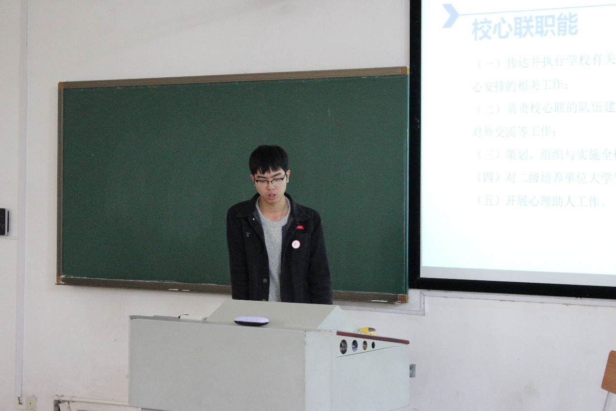 大会第二项,校心联主席钟楷铭讲话。首先,钟楷铭主席讲述了一些学生心理问题的案例,告诫我们要多多关注同学的心理状况,及时发现问题,并给予他们关爱。随后,向大家讲解校心联的组成以及各部门的职能,简单指明了各部门的前进方向。并且介绍了接下来要举办的一些活动,如心理知识竞赛和年会。校心联是一个大家庭,“家文化”需要在我们每一位校心联成员的手中传承下去。