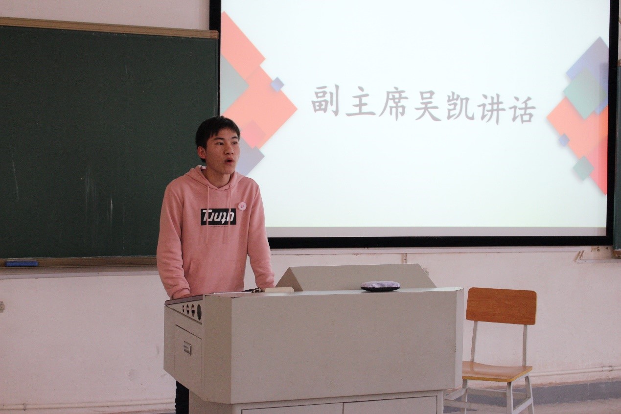 大会第四项,校心联副主席吴凯讲话。他提出了最近几次的活动中各部门出现的一些问题,如各部长也没有起好带头作用、成员工作进度也相对较慢,干事参与会议还有迟到早退的现象等。这些存在的问题,需要大家去改正。最后鼓励大家牢记使命,不忘初心。