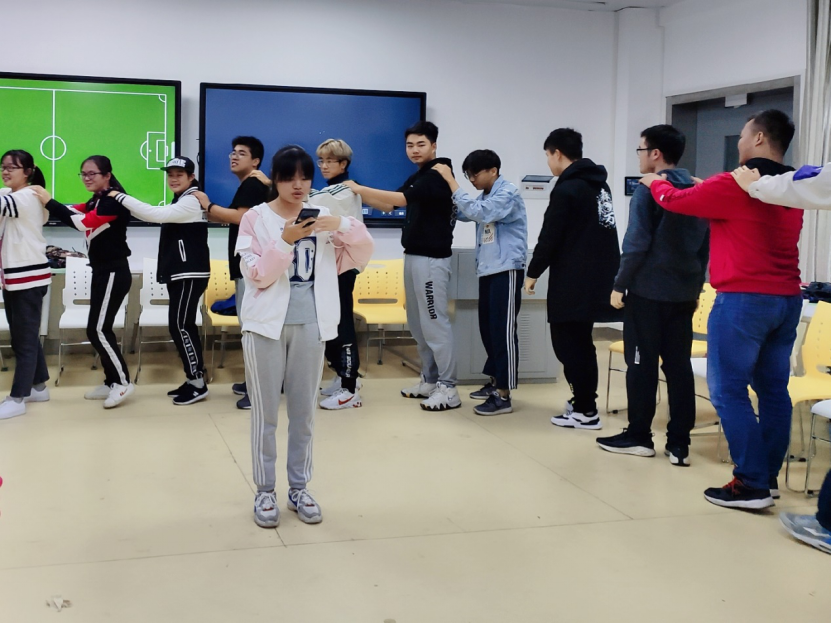 为了进一步活跃氛围,我们进行了热身操。将日常学习生活融入朗朗上口的绕口令,边念边为另一位同学按指令揉肩、捶背、掐腰,围绕成圈的我们做着按摩热身,一片欢声笑语。热身操中,一方面大家相互接触相互按摩,很舒服、很开心,另一方面绕口令也道出了大家现在每天需要做的事情。在每天的大学生活中,大家有苦也有乐,有抱怨也有欢笑。