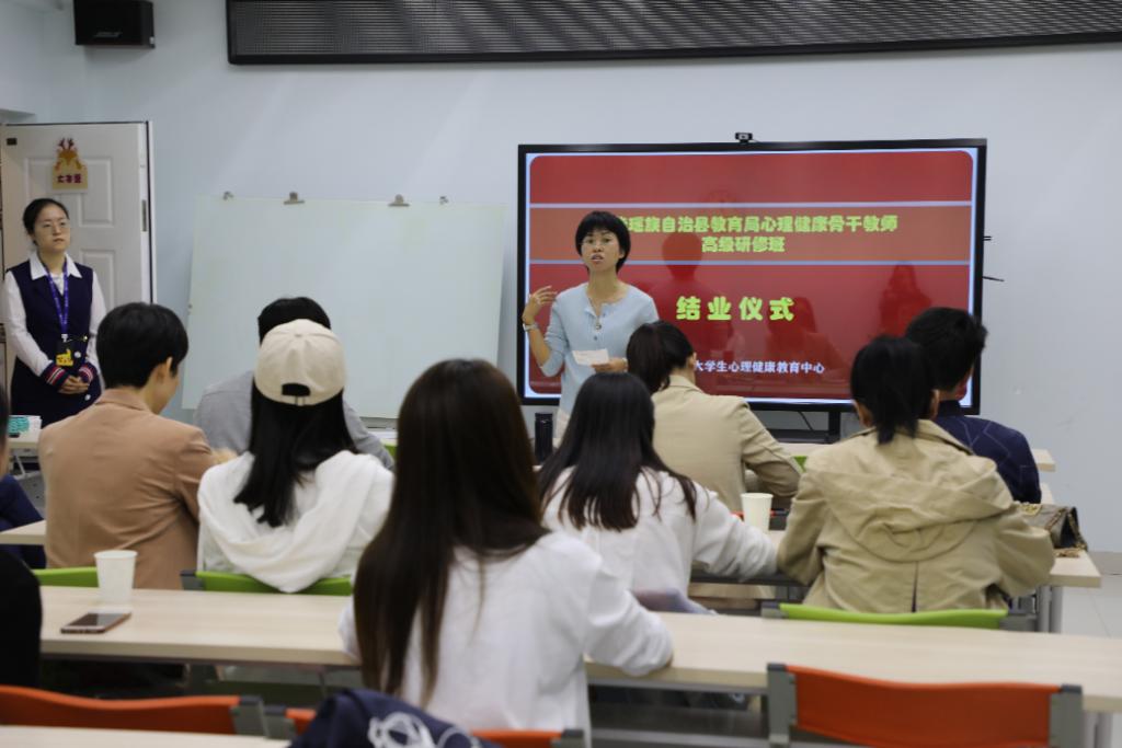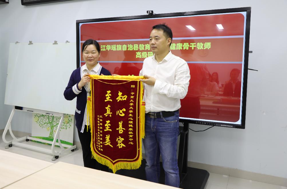 结业仪式上,江华瑶族自治县中小学心理健康教育指导中心主任唐添翼对中南大学为江华县心理健康骨干教师提供的宝贵学习机会表示感谢,并代表本次培训班向中南大学心理健康教育中心赠送锦旗,同时希望全体学员学以致用,将学习到的技术落实运用到今后的日常教学工作中去。