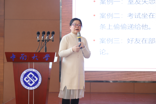 培训会第一讲由中南大学心理中心马晓虹老师讲授“朋辈互助员的‘道’与‘术’”主题讲座。马老师首先从“道”的方面展开阐述,让同学们思考什么是心理助人,以及为什么要心理助人、为什么你要来担任朋辈心理互助员。紧接着又从心理、助人、自助、自我成长等方面对什么是心理助人进行解释与讲解。再从“术”的方面说明,马老师首先表明良好的助人关系应该包括五个方面:尊重、热情、真诚、共情、积极关注。然后引导参加培训的人员关于如何助人的思路,分为倾听、提问、具体化三个方面。在讲课过程中,每个方面马老师都老师通过穿插自己遇到过的实例,让同学们产生了共鸣。