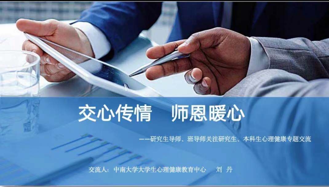 5月31日晚上19:00,湘雅医学院心理健康教育班导师专题培训会于线上举行。本次培训会由中南大学大学生心理健康教育中心刘丹老师主讲,湘雅医学院全体班导师参加,院心理专干王丹老师主持。