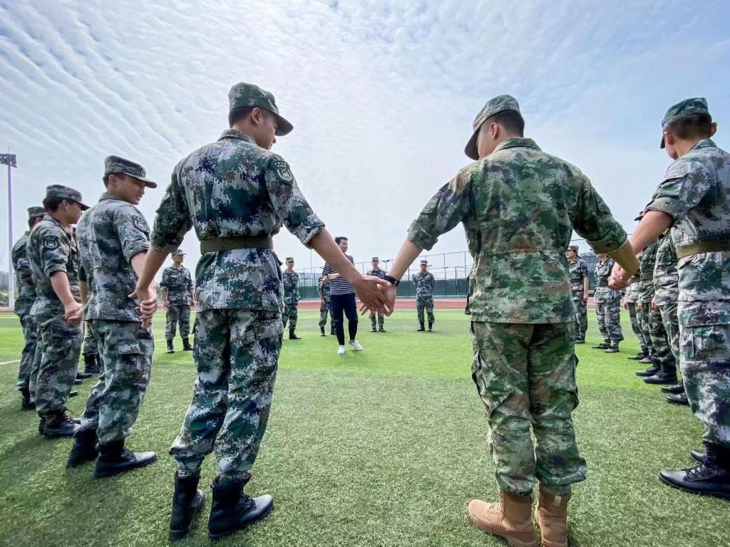 在理论课程之后,心理健康教育中心的多位老师组织自训营教官以排为单位组织了素质拓展项目的教学和体验。在老师们的指导下,自训营同学们先后完成了“信任人椅”、“一元几毫”、“众志成城”等团队协作项目,在游戏的团队战斗中增强了凝聚力。自训营营长刘富华表示,通过参与团辅活动,不仅学习了团辅活动的基本组织方法,更加强了军训教官之间的沟通协作,可以很好地提升队伍的战斗力和落实力,营造健康向上,和谐融洽的团队氛围,为高质量完成新生军训任务奠定基础。