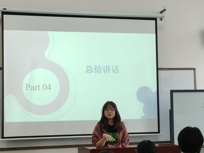最后,2021级辅导员胡雨琪老师发表总结讲话,她指出心理朋辈互助会与各班的心理委员工作非常重要,大家要以高度的责任感来做这个工作。