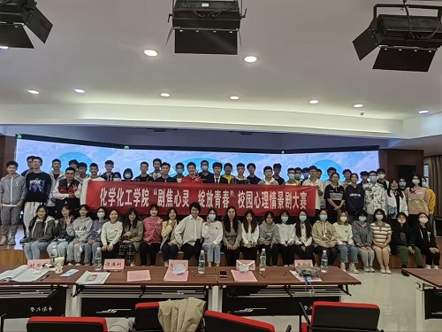 为丰富学生课余生活,关注学生心理健康,化学化工学院朋辈心理互助会于2022年10月5日下午在毓秀楼411演播室举办了“剧焦心灵,绽放青春”校园心理情景剧大赛,共有来自大一年级和大二年级的8支队伍参与其中,学院心理专干白丹妮、2021级本科生辅导员胡雨琪、2022级本科生辅导员肖茜斤,2022级本科生辅导员谭澳利,朋辈心理互助会研究生部李霜凝和王凌洁担任本次大赛评委。