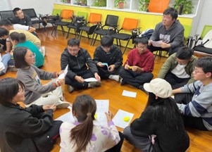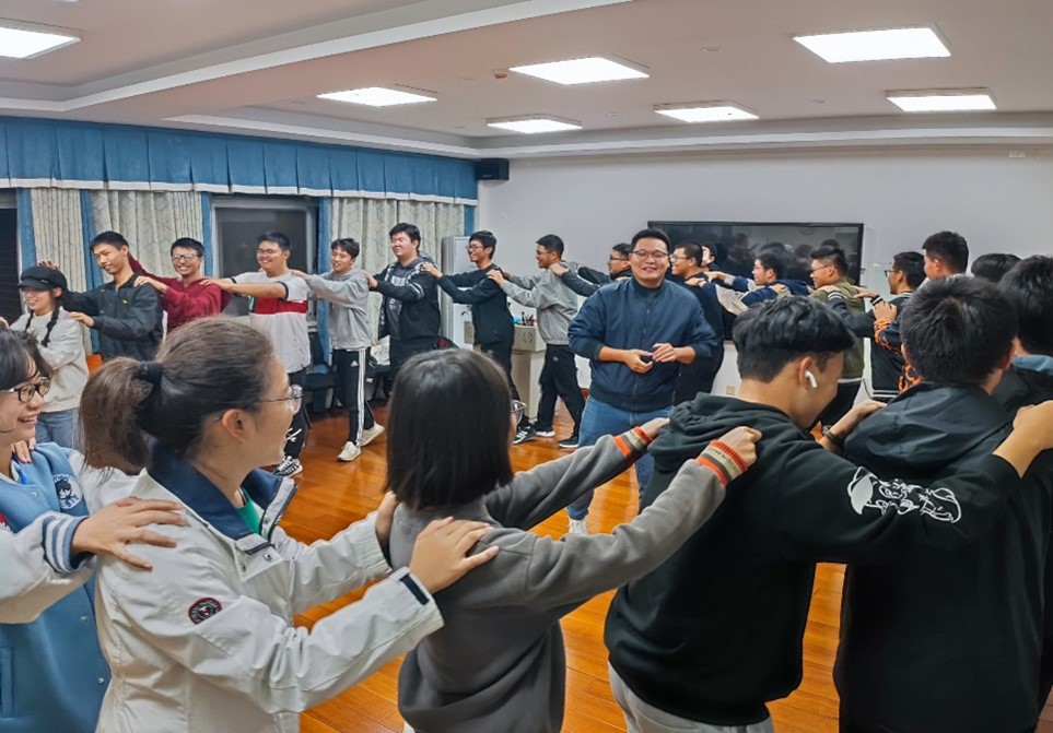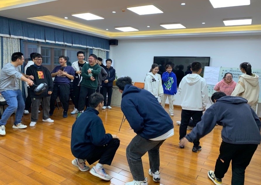 在正式游戏过程中,形式多样的团体游戏拉近了同学们之间的距离,培养了良好的团体意识。“姓名滚雪球”在考验记忆力的同时也有助于大家了解、熟悉彼此;“爬人梯”难以凭借一己之力完成,在整个小组背靠背共同向上站起的过程中,默契和信任缺一不可;“找自己”游戏中同学们通过握手交换身份,又在交流互助中找回自己名字对应的人。每次游戏结束后,团辅指导老师都会引导大家思考游戏背后的意义,让同学在收获了欢声笑语的同时也收获了心灵的感悟。