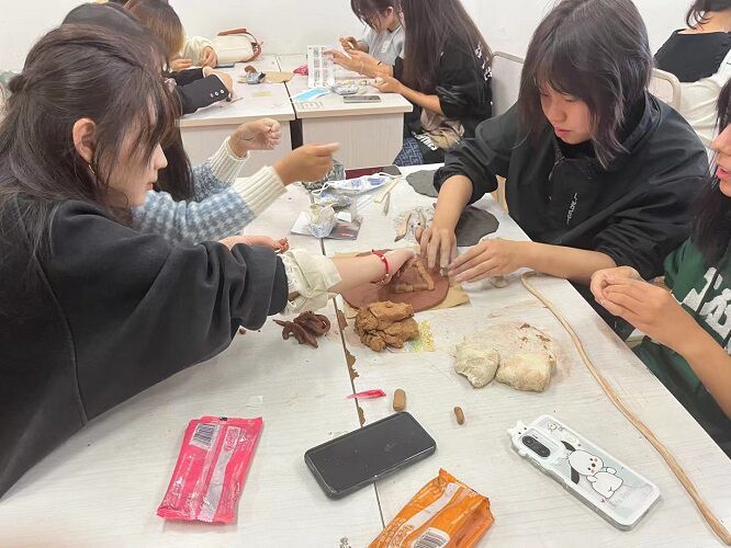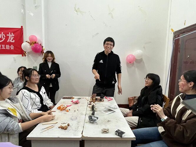 随后,正式进入泥塑制作环节,本次泥塑活动的主题为“心情”,在场同学随机分为十个小组,在规定时间内利用心助会提前准备好的泥塑材料来制作作品。各组成员们发挥想象力,将“心情”寓于泥塑作品,尽情创作。在动手制作的过程中,同学们寻找到了乐趣,同时也缓解了心理压力。朋辈之间协同合作,现场氛围其乐融融。