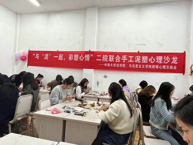 为帮助同学们缓解压力,促进朋辈间交流互动,11月28日下午7点,中南大学法学院朋辈心理互助会、马克思主义学院朋辈心理互助会在文法楼125室联合举办了以“与‘泥’一起,彩塑心情”为主题的手工泥塑心理沙龙活动。来自法学院、马克思主义学院的同学们积极报名,按时到场参加。