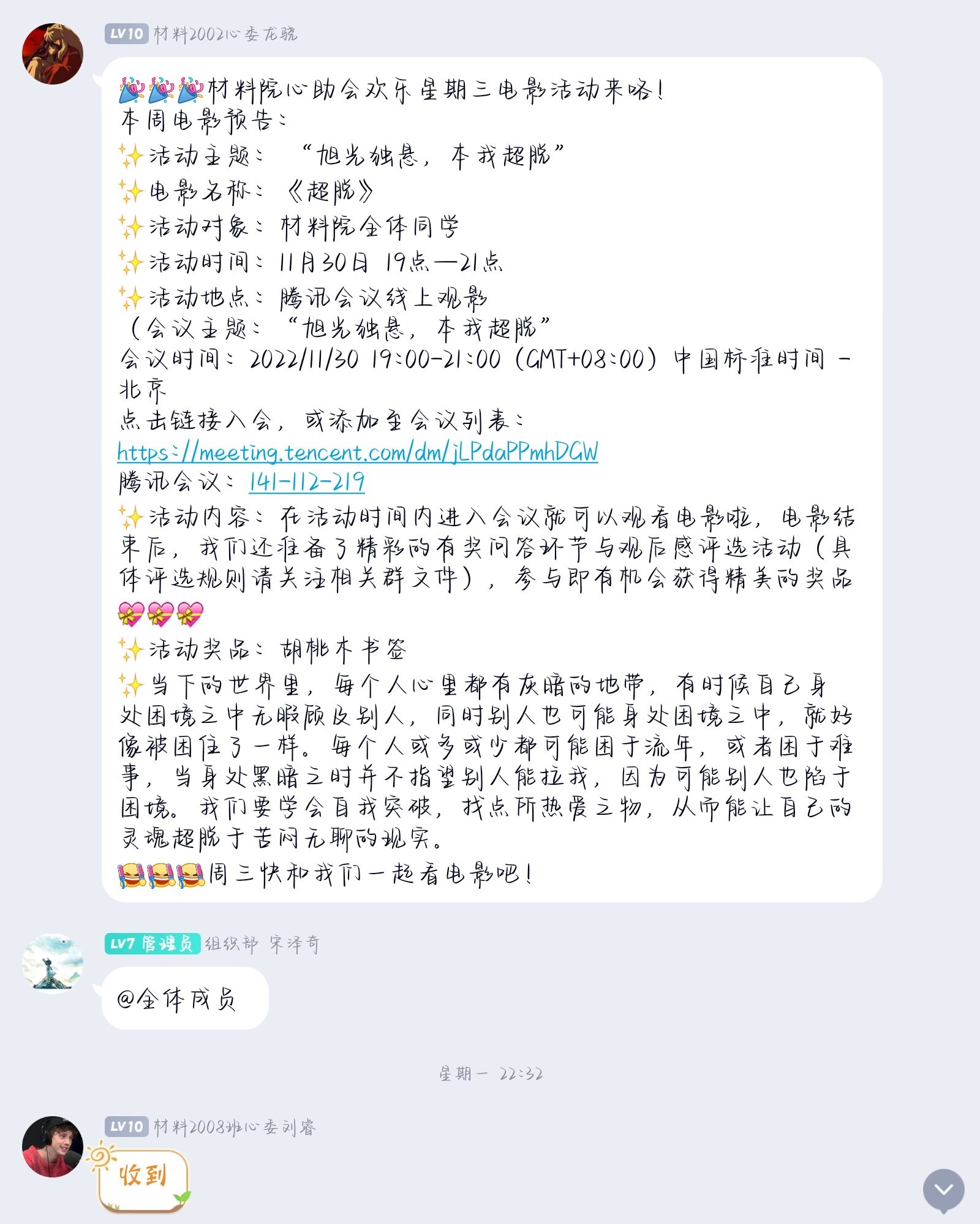 为了促进同学们的心理成长,保持良好的心理健康状态,本周三晚19点至21点材料院心助会开展了主题为“旭光独悬,本我超脱”的观影活动,组织同学们于腾讯会议观看影片《超脱》。