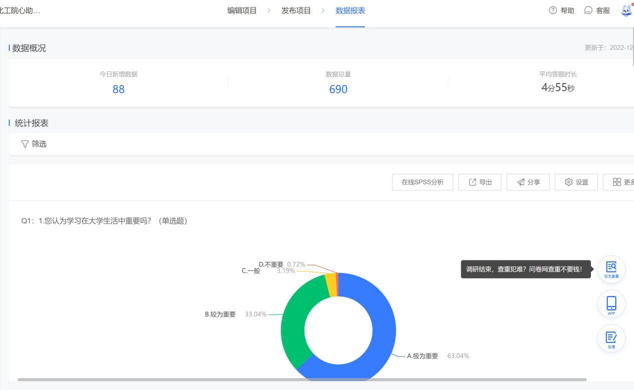本次问卷的内容主要涉及对学习重要性的认知、对新环境的适应情况、应对期末备考的状态和恋爱观等问题。根据调查结果,我们了解到绝大多数同学已经完全适应并融入新环境和新学期生活,并认为现阶段的大学生活与自己的预期较为相符,对接下来的生活目标明确、信心十足。
