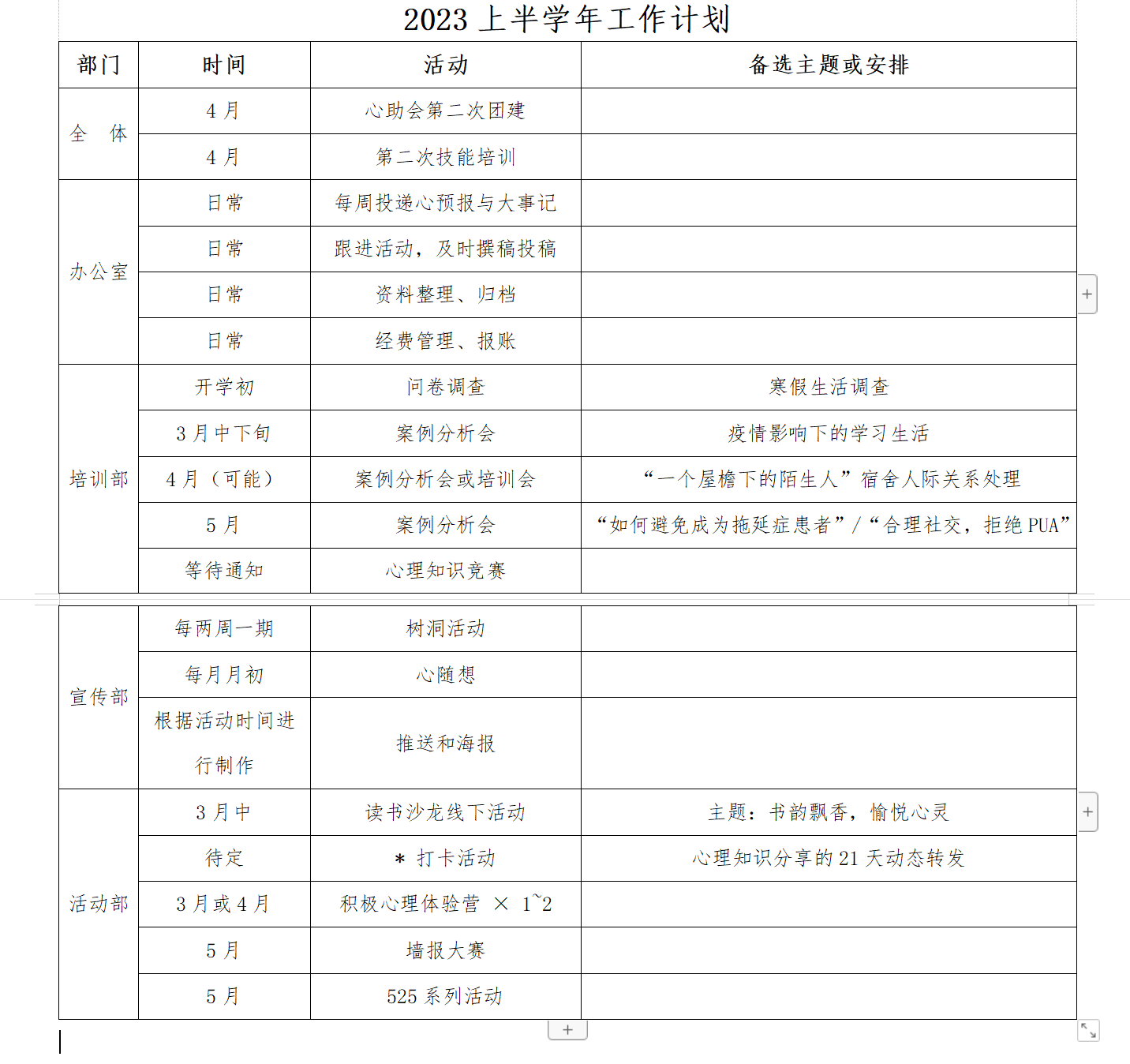 会议开始,刘莹莹同学介绍心助会下学期计划开展的团体活动和大型活动,如团建、525系列活动等。随后,各个部门按照顺序就新学期的工作计划进行详细的讲解,大家首先选定下学期将要开展活动的主题和备选主题,对活动进行详细讲解,随后确定了活动举办的大致时间范围。从大型活动到日常工作,各部门各司其职,都有明确而清晰的计划。