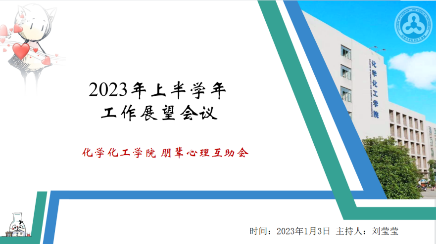 为做好对新学期化学化工学院心理健康教育工作的计划安排,化学化工学院朋辈心理互助会于2023年1月3日召开了线上工作会议,了。会议由学院心助会本科生学生负责人刘莹莹主持,化学化工学院心理专干白丹妮老师出席,心助会全体成员参加,共同对新学期的工作做出规划。