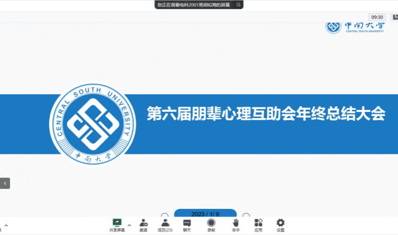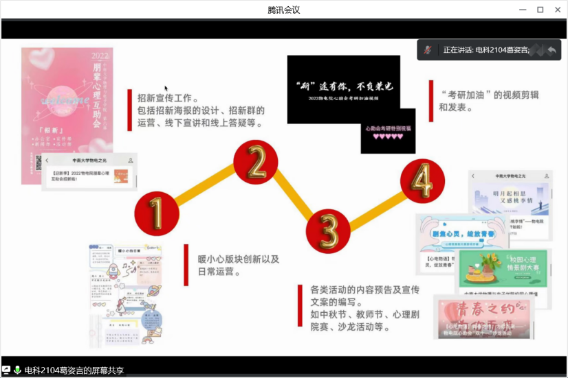 2023年1月9日下午两点,物理与电子学院第六届朋辈心理互助会年终总结大会通过腾讯会议线上展开。此次会议由会长胡似海主持,各部门部长以及所属部门干事依次对本部门发表年终工作总结。