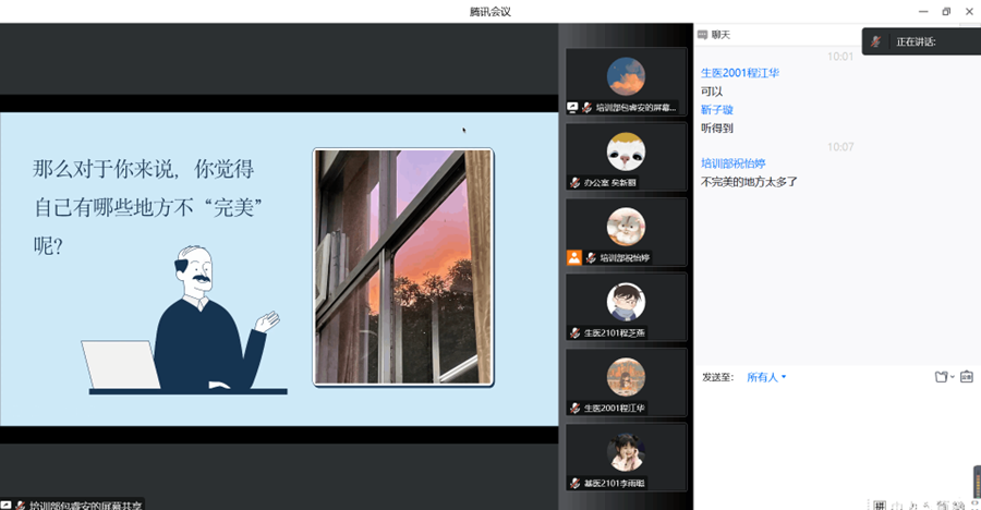 会议主题为“接纳不完美的自己”,由培训部的包睿安同学作为主讲人,从引言、情景再现、共商对策、接纳不完美四个方面进行了阐述说明。