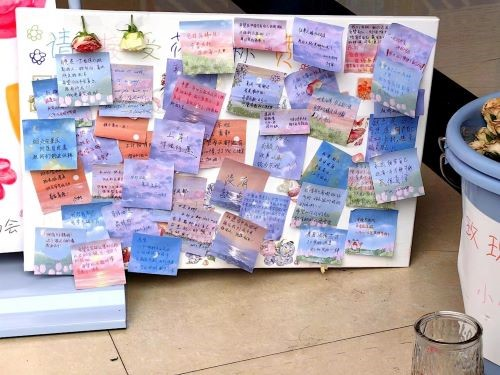 人文学院心助会为同学们准备了鲜艳的花朵与背面写着格言名句的明信片作为参加活动的礼物。同学们先挑选不同颜色的水笔,在各种款式的便利贴上写下对自我的赞美以及对未来的期许,再将便利贴贴在易拉宝上来换取花朵与明信片。有的人写自己“热爱自由,不被束缚”,有的人写“我唱歌特别好听”,有的人写“你是一个温柔细腻、善良大方的女孩”……各色水笔在各色便利贴上展示每个人的独特亮点。