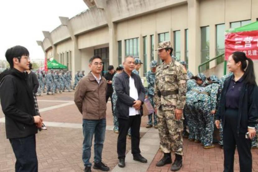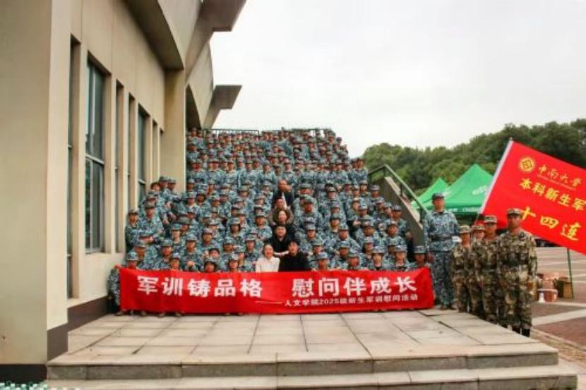 2025年10月17日10时,人文学院朋辈心理互助会联合人文学院团委学生会在中南大学潇湘校区体育馆西门14连训练场地举办了以“迷彩壮歌,秋风送暖”为主题的2025级新生军训慰问活动。本次活动慰问团由中南大学人文学院党委书记罗军飞、党委副书记刘亚红、副院长刘新少、学工办全体辅导员、新生班导师助理杨紫金以及人文学院心助会与人文学院团学会的工作人员组成。