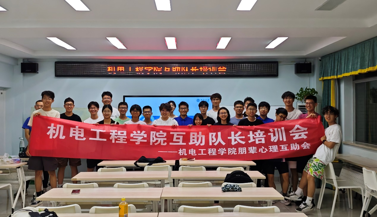 培训结束后,全体参与人员在写有 “机电工程学院互助队长培训会 —— 机电工程学院朋辈心理互助会” 的横幅前合影,定格下这一充实且有意义的时刻。