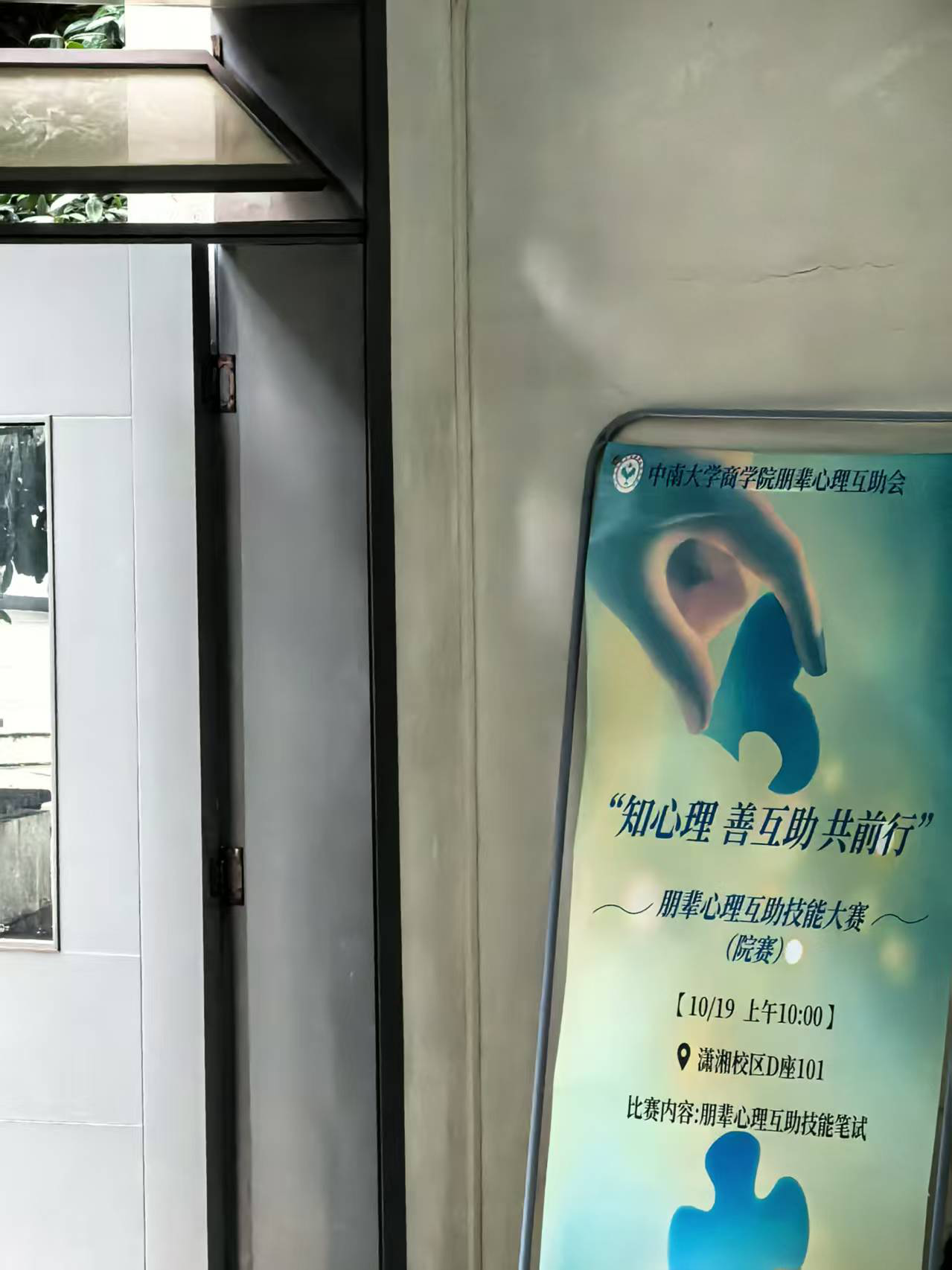 为进一步推动校园心理健康教育,提升学生朋辈互助专业技能,2025 年 10 月19 日上午 10 点,由中南大学商学院朋辈心理互助会主办的 “知心理 善互助 共前行” 朋辈心理互助技能大赛院赛笔试环节,在 D 座 101 教室如期举行。商学院各年级报名选手及互助队长按要求参与考试,整场活动有序推进。