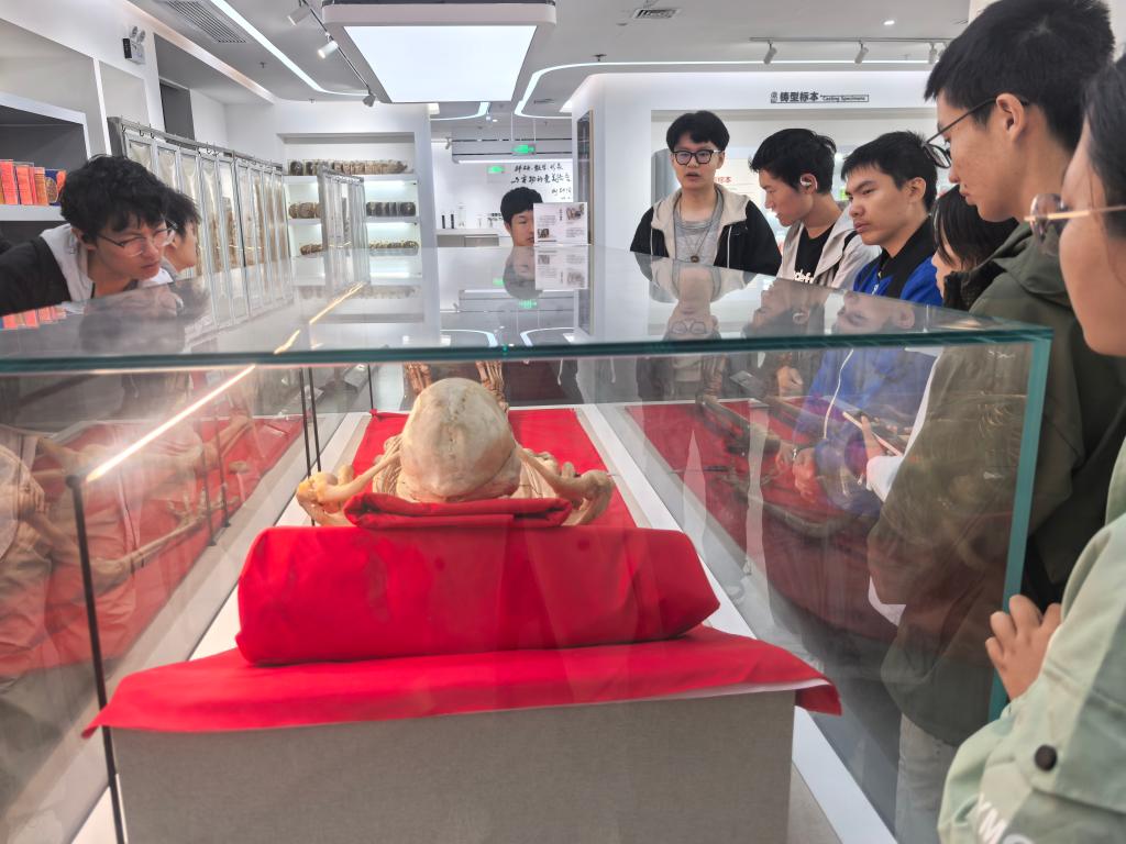 下午三时,同学们在讲解员的带领下步入形态学馆。从正常人体到病理器官组织和胚胎,标本涉及解剖、病理、生理等多学科内容,2.48米的“女巨人”遗骨、清代干尸等独特展品,不仅展现了生命构造的精妙,更引发了大家对生命本身的敬畏与思考。
