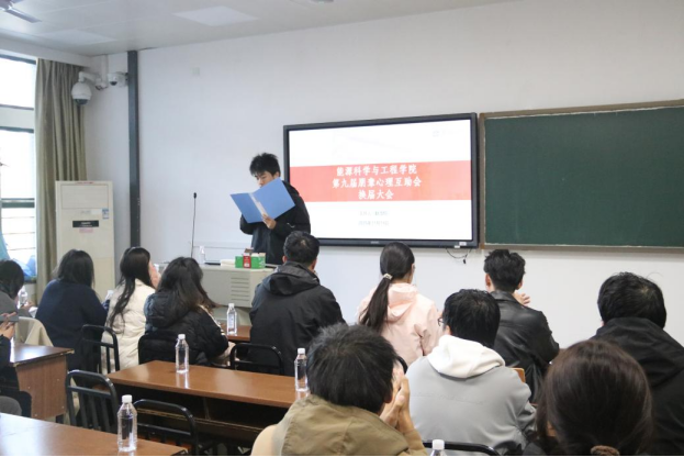 2025年11月19日15:00,能源科学与工程学院“薪火相传,聚力前行”心助会第九届换届大会于A座222教室顺利举办。本次活动旨在完成心助会换届成员的工作交接,增加全体干事对组织的认同感、归属感和参与热情。出席本次大会的有能源院23级辅导员张洪林老师、第八届心助会会长、第九届心助会全体成员。