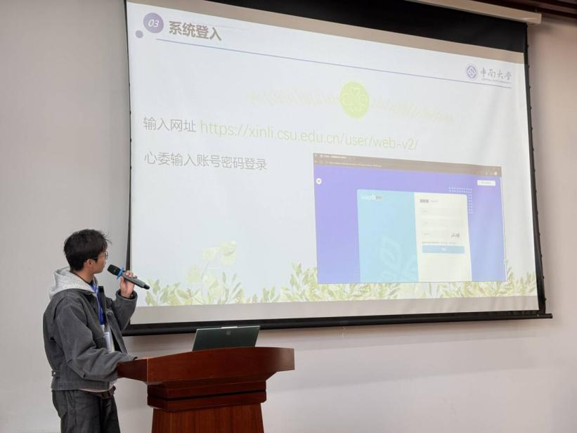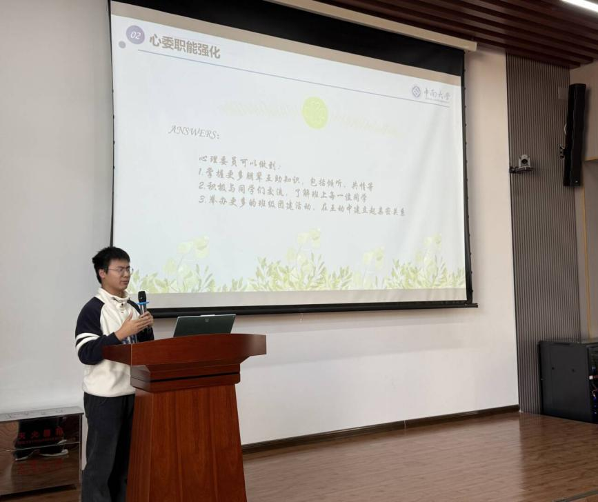 随后,部长王禹围绕心理委员的基本职责、日常沟通技巧等内容进行了深入浅出的阐述,帮助心委们明确自身定位。他还系统介绍了心理问题的观察与上报流程,并向大家推荐了学校线上心理预约平台、优质心理科普公众号及其他常见服务渠道,为心理委员开展工作提供了丰富的资源支持。此外,他就如何与寝室长协同构建有效的寝室情绪联络网进行了详细阐述,并详细解读了心理委员工作评分细则,激励大家认真履职。