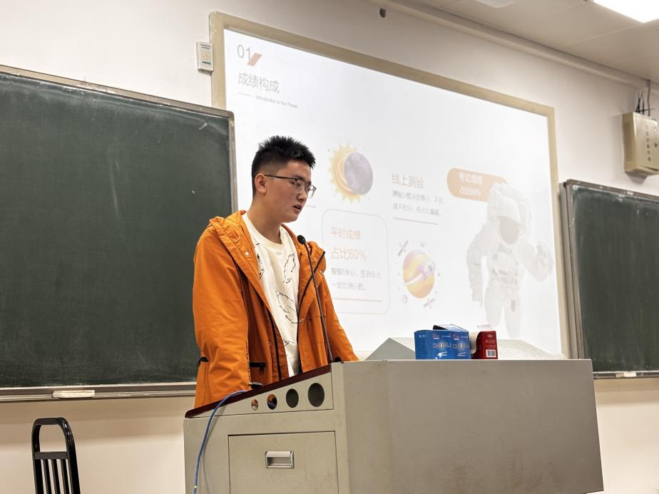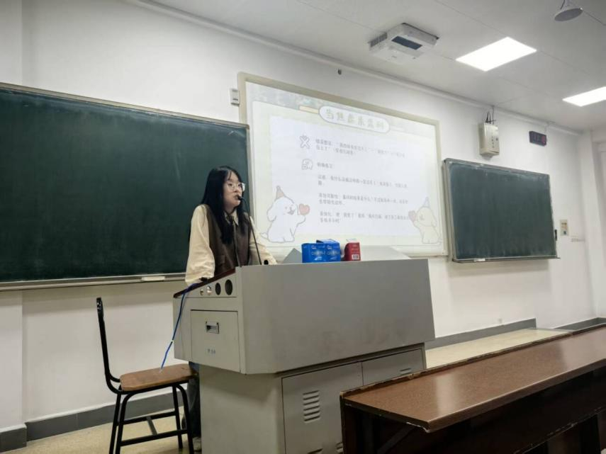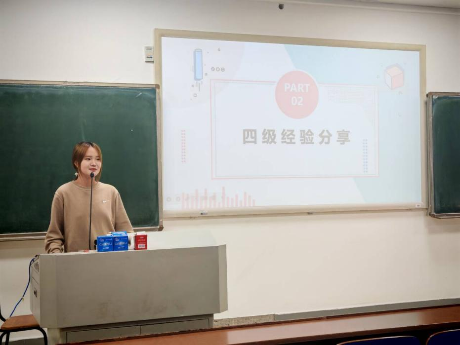 紧接着,预防2401班孙园舒同学为大一新生们分享大学英语的学习技巧,着重强调大学英语四级考试的重要性,详细介绍了四级考试题型,同时鼓励大家开始积极备考。