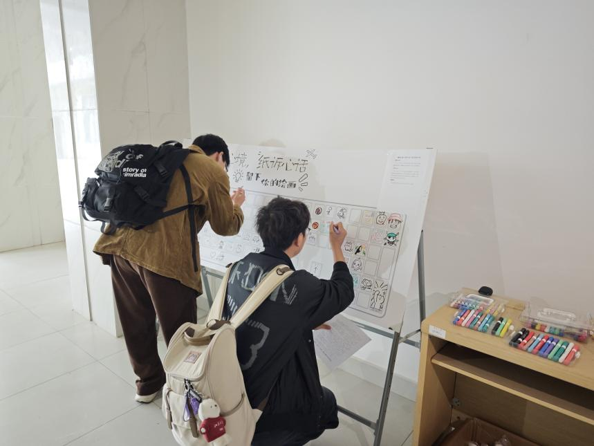 本次活动将科技元素与艺术表达巧妙融合,设置了“键绘心境”与“纸诉心话”两个兼具趣味性、参与感与疗愈性的互动环节,吸引了许多同学驻足参与,氛围温馨而专注。