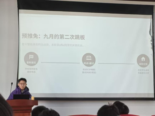 接着,梁业靖结合自身亲身经历,详细讲解了保研制胜策略与心得。内容涵盖长期学业规划、科研项目参与、社会实践积累、面试准备与心态调节等多个维度。不仅分享了成功经验,也坦诚回顾了走过的弯路与挑战,为在校学生提供了真实可鉴的学习样本与情感共鸣。在分享过程中,“合理规划时间”“主动积累经历”“保持积极心态”等关键词被反复提及,彰显出务实而温暖的成长陪伴。