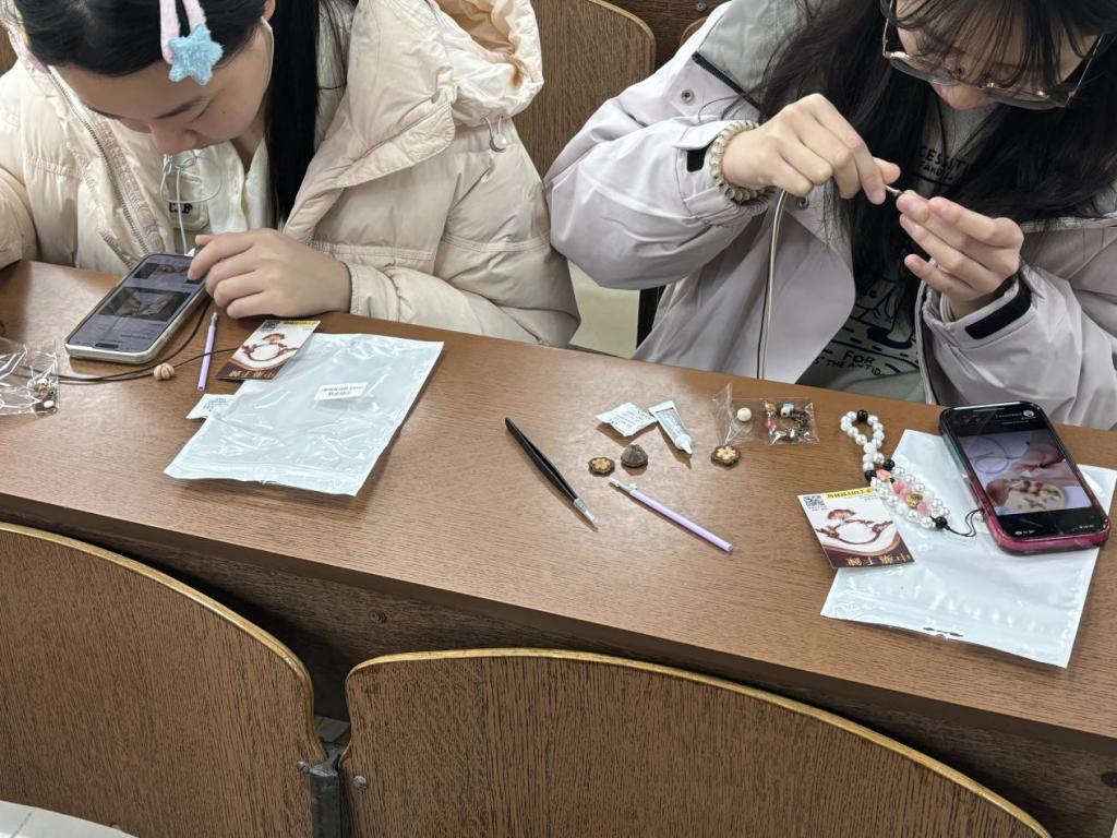 在活动进行时,现场暖意融融,两院同学热情高涨。鲜花拓印区里,大家围坐探讨花瓣与叶片的搭配逻辑,从色彩层次到拓印手法反复尝试,力求让自然肌理在纸上呈现更丰富的画面感;植物标本书签制作环节,有同学分享真空干燥、硅胶脱水等花草保存妙招,更有同学提议将古典诗词镌刻于书签之上,让自然之美与人文底蕴相融;干果药材手链编织区尤为热闹,药学院同学讲解药材的药用价值与文化寓意,生科院同学则结合编绳技艺创新设计,杜仲、枸杞等药材化身别致饰品,奇思妙想的创意方案层出不穷。