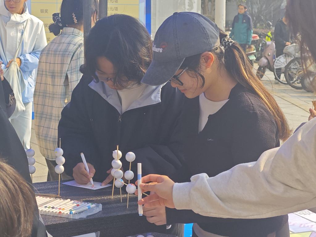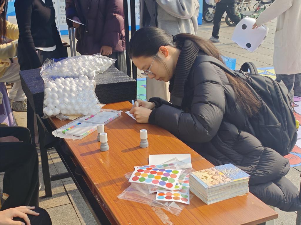 活动从中午12:00开始,现场设有多个趣味游戏区域。参与者首先在签到处领取明信片,随后依次体验“心理大富翁”“情绪地图”“彩色笑脸”等环节。在“心理大富翁”中,同学们通过投掷骰子、回答心理知识问题,在游戏中学习心理调适方法;“情绪地图”则引导参与者用彩色毛线缠绕情感词汇,增强情绪觉察与表达;“彩色笑脸”环节鼓励大家亲手绘制表情泡沫球,制作独一无二的“心理糖葫芦”,现场欢声笑语不断。