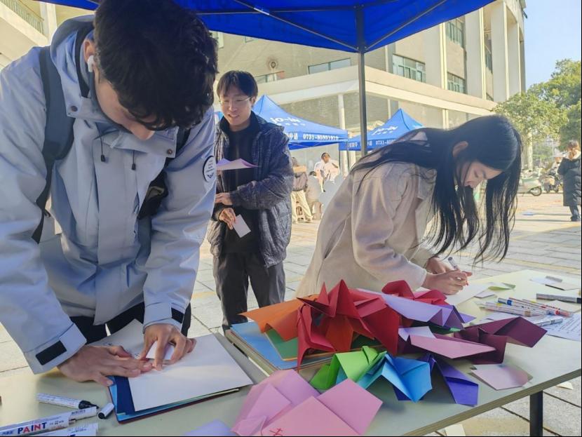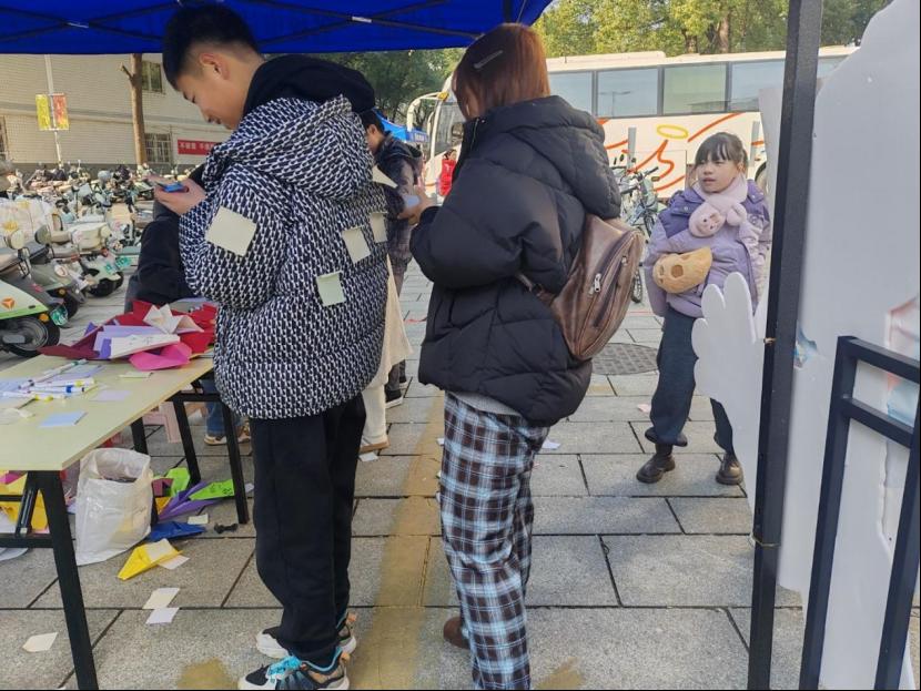 在“焦虑漂流纸飞机”游戏中,参与者在彩色卡纸上匿名写下对未来的担忧,如“就业迷茫”、“学业压力”,亲手将其折成纸飞机,投向象征希望的靶心区域。这一游戏帮助同学们完成了一次情绪的梳理与投射。无论纸飞机最终落点如何,放飞本身即是一次对压力的告别和对未来的积极寄语。