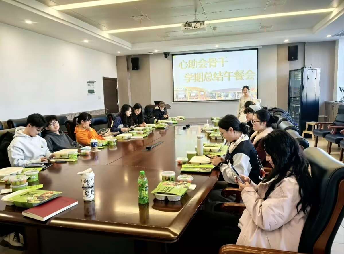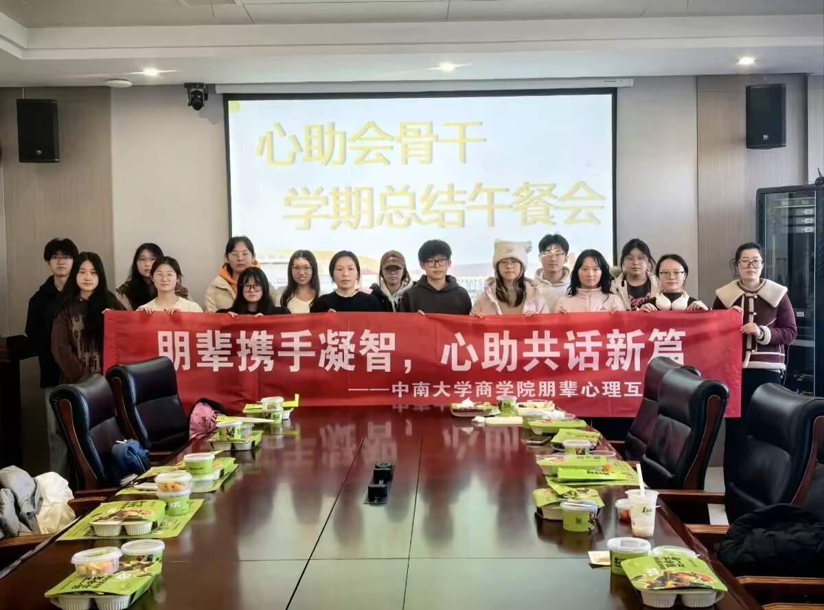 2025年12月25日中午12:10,中南大学商学院朋辈心理互助会在江湾楼会议室368举办“朋辈携手凝智,心助共话新篇”期末总结午餐会。本次活动参与人员有心助会会长团、部长团及心理专干黄河沙老师,活动主要内容是梳理学期工作成果、凝聚骨干智慧、规划未来发展。