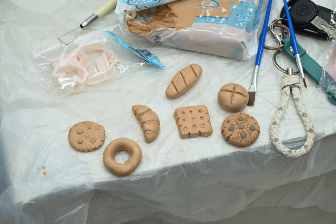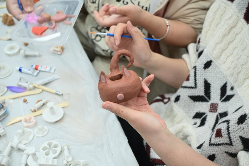 活动开始,主持人简要介绍了陶土风铃的制作方法与步骤要点。随后,同学们在示范与协助下,依次开展粘土揉捏、造型塑形、细节装饰、色彩绘制与风铃组装等环节。揉捏粘土时,大家感受粘土在手中的柔软易塑;塑形阶段,有人制作几何造型,有人融入小猫、花朵、饼干等可爱元素,赋予风铃独特个性;在色彩绘制环节,同学们精心调配颜色,为已塑形的粘土部件上色,以色彩传递情绪与创意。同学们完成作品后,在座位上相互欣赏创作成果,分享制作心得。活动最后,同学们凭借精巧构思和独特创意获得了活动纪念品。
