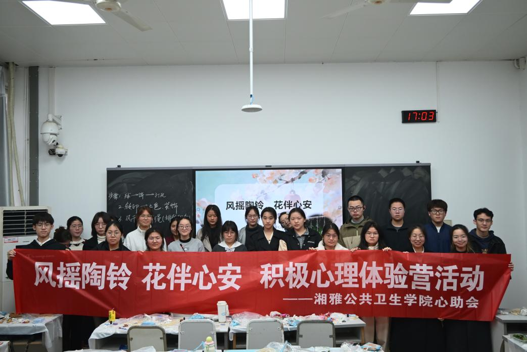 2026年3月29日,“风摇陶铃,花伴心安”积极心理体验营在杏林校区福庆楼S116教室顺利举办。本次活动面向湘雅公共卫生学院全体本科生,共35名同学参与,旨在通过陶土风铃手工创作的形式,为学生搭建心理减压与情绪调节的实践平台,将心理健康教育融入劳动与美育环节。