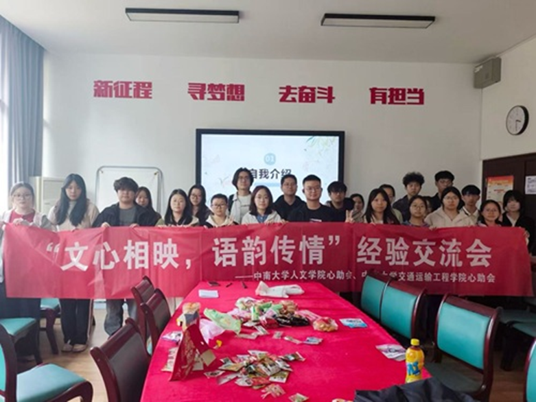 2026年4月1日14时30分至15时30分,为加强院际合作、提升工作能力,人文学院心助会联合交通运输工程学院心助会,在麓南校区文法楼234教室顺利召开了以“文心相映,语韵传情”为主题的交流分享会。本次活动面向人文学院、交通运输工程学院全体学生,旨在通过经验交流与资源共享,为后续积极心理体验营等活动的顺利开展凝聚智慧、奠定基础。