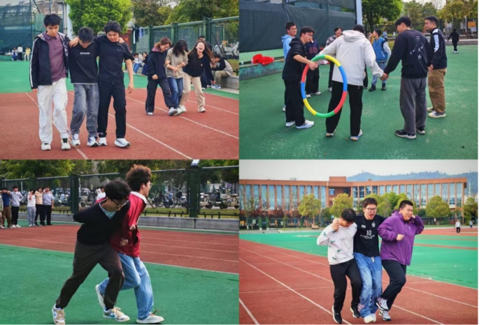 “情绪气球”环节,同学们们默契配合,接力传递气球,抵达终点后,大家区分积极、消极情绪气球,合力挤爆“负面情绪”气球以释放压力,在趣味互动中传递正向能量;“一圈到底”环节,队员们手拉手站成一排,呼啦圈依次穿过每个人,大家相互配合、调整节奏,在一次次磨合中凝聚团队合力,现场加油声、欢呼声此起彼伏;“三人四足”环节,同学们喊着整齐口号步调一致向终点迈进,在并肩前行中深化信任与默契,充分展现了顽强拼搏的精神风貌。