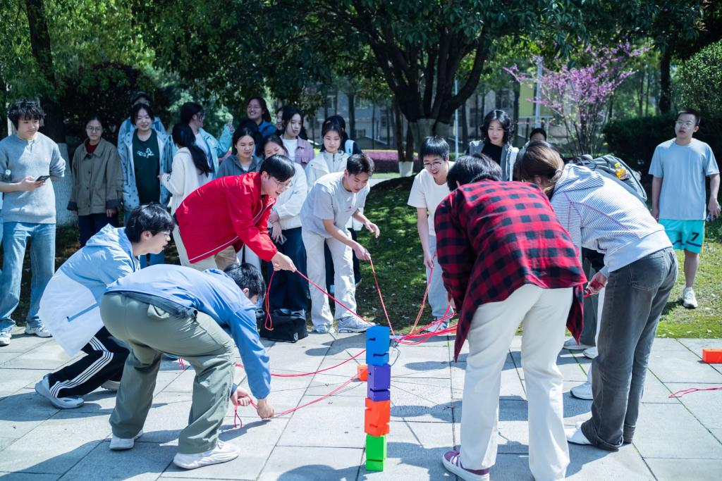 活动共设置合力筑塔、珠行万里、情绪气球、一圈到底、三人四足五个项目,兼顾团队协作与趣味挑战。各班同学踊跃参与,现场气氛热烈。 合力筑塔项目中,十人一组通过拉绳控制塔钩,将塔块层层垒起,考验了团队的默契与耐心。珠行万里则要求队员们用管槽接力运送能量球,球落重回起点,现场加油声此起彼伏。