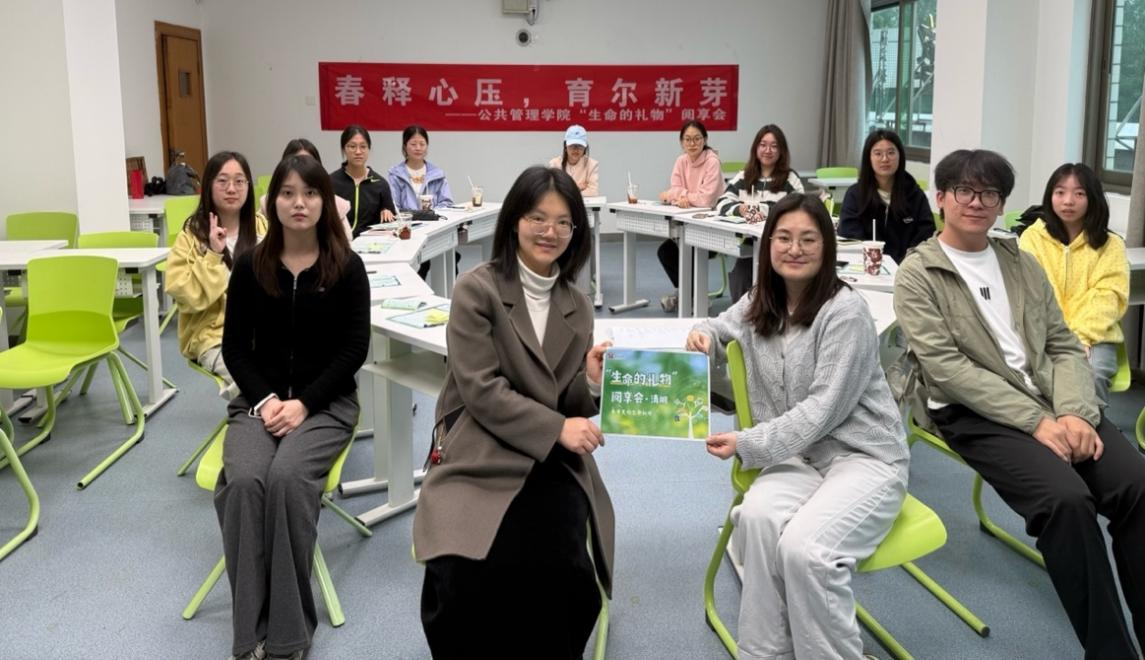 为帮助学生情绪疗愈,创新心育活动形式,2026年4月15日15点,公共管理学院朋辈心理互助会在天心校区世纪楼305,开展“春释心压,育尔新芽”——“生命的礼物”阅享会活动。本次活动特邀蝴蝶之家覃湘老师主讲,学院梁慧老师莅临指导,同学们都积极参与这场温暖治愈的心灵之旅。